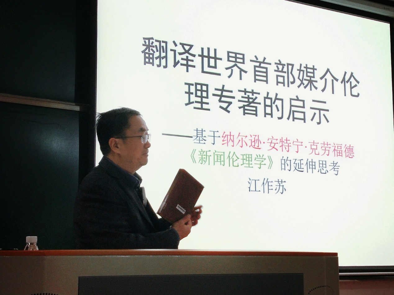 11月17日晚,特邀请新闻传播学院前任院长、中国新闻最高奖长江韬奋奖获得者——江作苏教授前来我院,以“探索世界媒介伦理之源——基于《新闻伦理学》的延伸思考”为专题,为20级新传全体研究生带来讲座。
