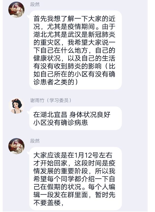 在来势汹汹的疫情面前,师生健康和安全一直是学院领导班子的牵挂,早在1月下旬,学院党委领导要求各教师在学院微信群回复是否在武汉,家中是否有人感染等情况,及时了解教师团队的情况 圪看;要求各年级辅导员迅速统计学生在校情况,返家情况,有无新冠肺炎相关症状等,及时了解学生的动态,体现了“爱院如家、爱生如子”的办院理念。截止1月23日,学院含退休教师在内,有4名教师在湖北省其他地区,26名教师在武汉,15名教师在省外,院领导班子3人在武汉,1人在红安,全院780余名学生均返回家中。