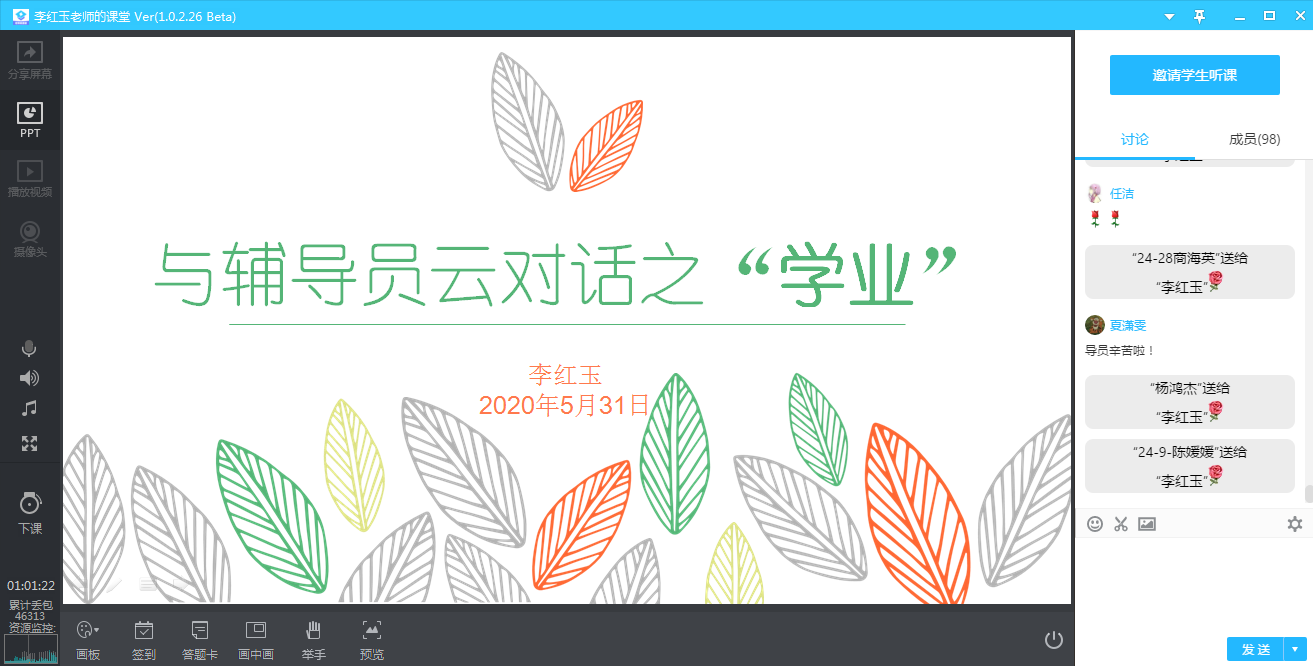 5月31日,在辅导员李红玉的组织下,2018级本科生通过线上平台进行了以“学业”为主的云对话活动。