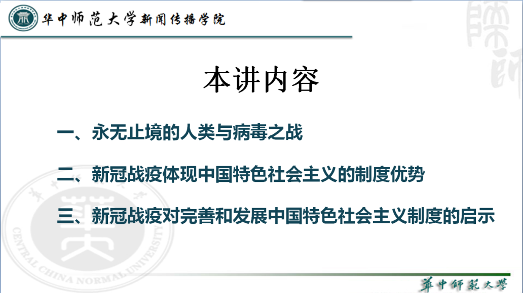课程内容主要包括三个部分:永无止境的人类与病毒之战、新冠战役体现中国特色社会主义的制度优势以及新冠战役对完善和发展中国特色社会主义制度的启示。