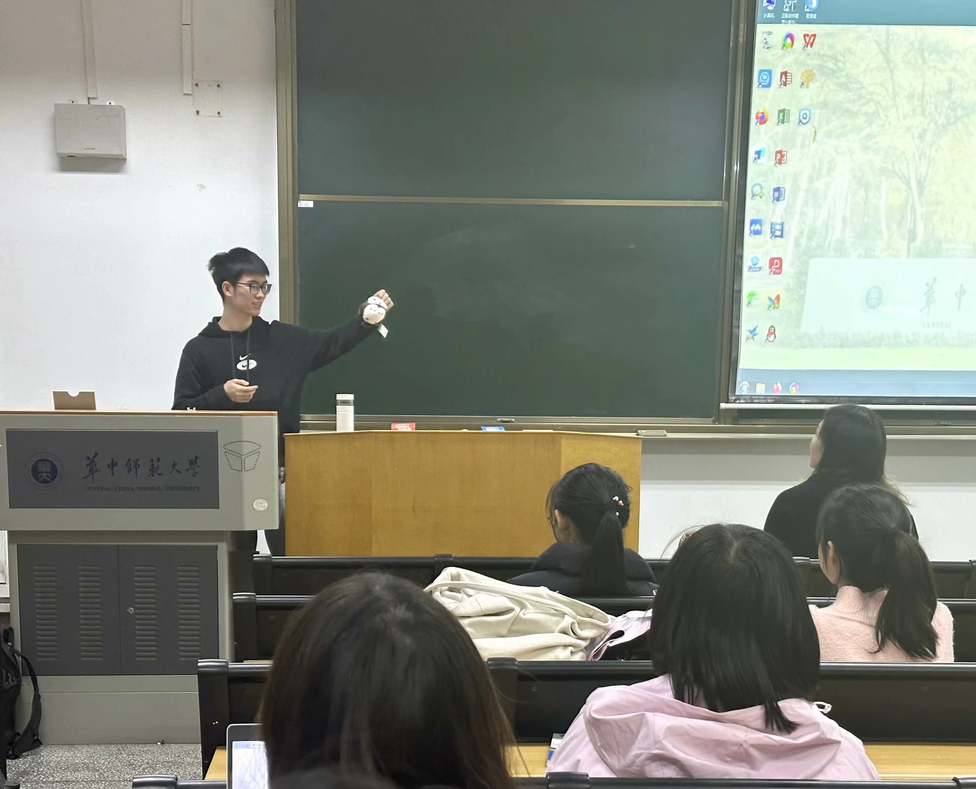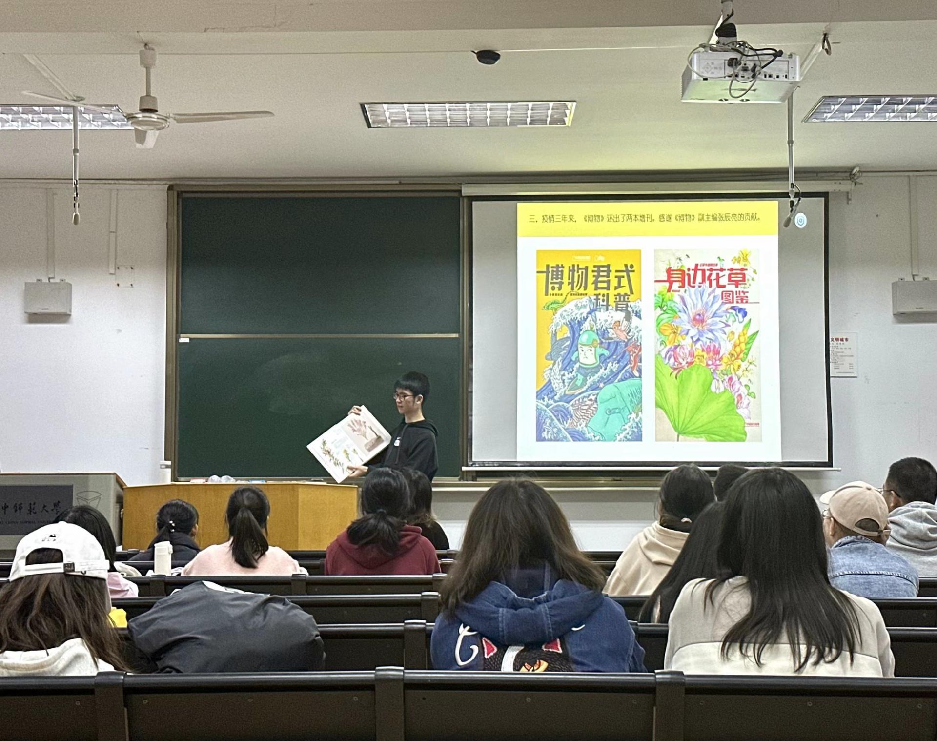除了个人的成长历程外,他分享最多的还是《博物》杂志。他介绍了杂志的内容特色、主编愿景——“让更多人重返天地万物的世界”、科普巨星“无穷小亮”的成功之道。令大家惊喜的是,他这次分享还带来了杂志社的动物小挂件作为送给新生们的礼物。