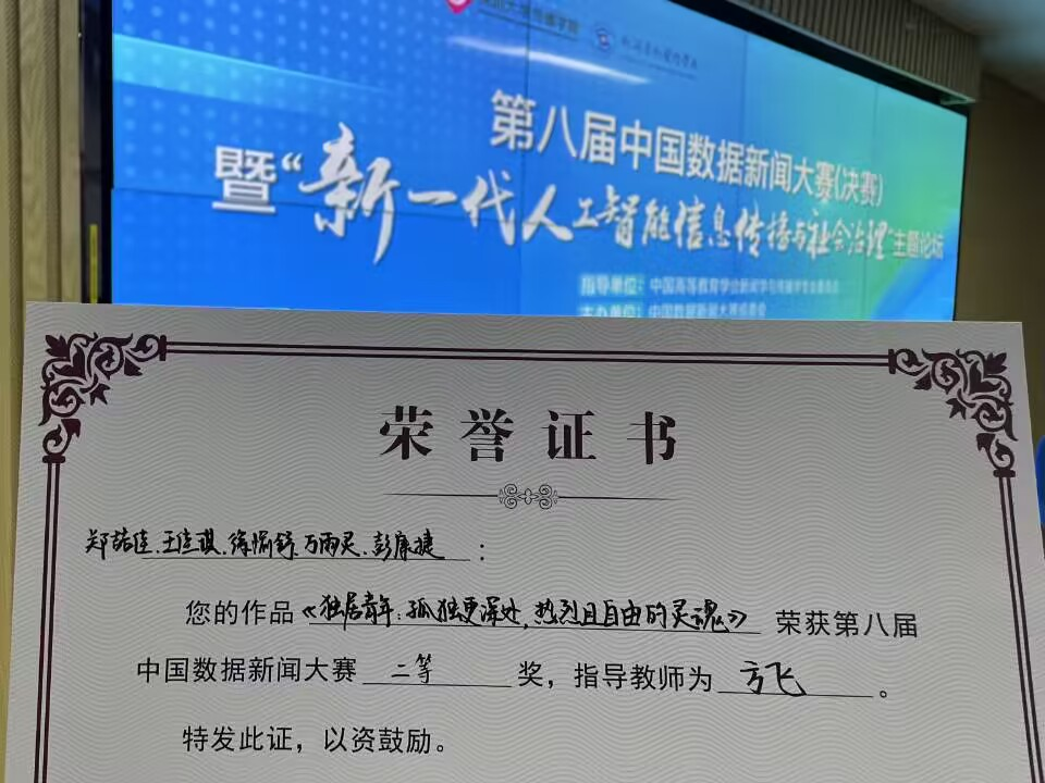 2023年12月2日,第八届中国数据新闻大赛决赛暨“新一代人工智能信息传播与社会治理”论坛在深圳大学召开。我院学生作品《独居青年:孤独更深处,热烈且自由的灵魂》荣获全国二等奖佳绩。