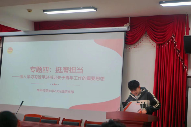 班会的最后一项“挺膺而出——深入学习习近平总书记关于青年工作的重要思想”主题团课由团支书王祝潼主持。他从三个方面阐释了习近平总书记对青年工作的重要思想。长期以来,习近平总书记立足于“确保党的事业薪火相传,确保中华民族永续发展”的深远考虑,将青年工作放在党和国家发展的战略高度去考量,激励广大青年担当起党和人民赋予的历史重任。