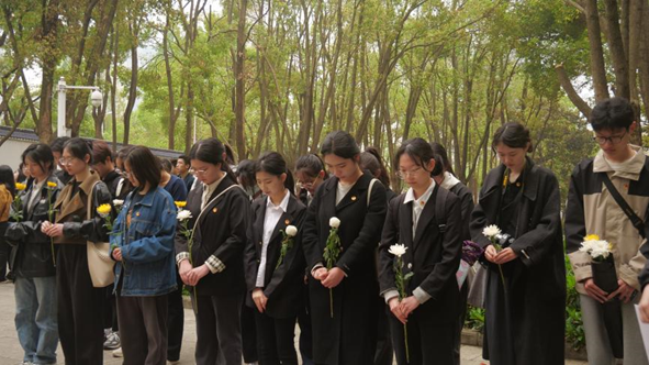 2204班班长李佳一则以生动的话语分享了革命烈士卢德铭的生平。在众烈士“精神不死”的主墓碑前,众人依次敬献鲜花,而后轻抚革命烈士名字,以表哀思。