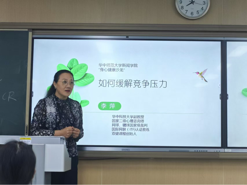 华中科技大学体育学院的李萍老师在正式分享之前,通过几个简单的热身运动带领大家缓解放松,同时活跃班会气氛。她以自身跨界学习美容美发的经历为切入点,生动阐述了如何在面对非兴趣专业时寻找乐趣与成长的可能。多年深耕于身心双健地李老师还结合心理学知识,为同学们讲解了压力的来源与管理方法,强调“想要”是压力的主要来源,建议大家学会调整心态,享受过程而非过分追求结果。对于如何缓解竞争压力,她给出了16条的具体方法,鼓励大家通过运动、冥想等方式来放松身心。