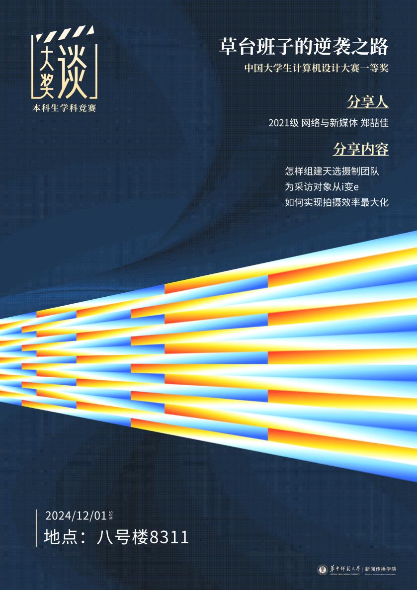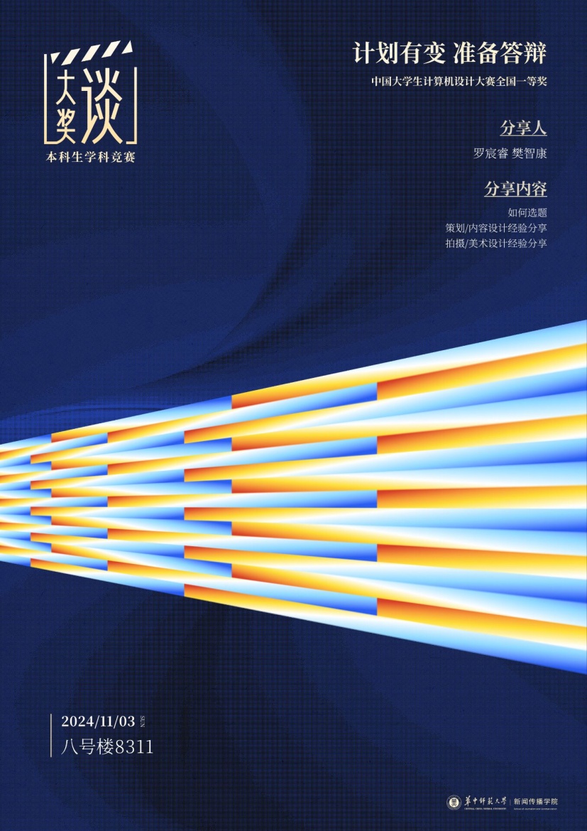 11月3日,罗宸睿与樊智康以“计划有变,准备答辩”为主题,深入剖析了竞赛中选题、策划与内容设计、拍摄与美术设计等方面的关键要点。他们团队创作的短片《圆方之比,天地之合》在全国大学生计算机设计大赛数字短片单元荣获全国一等奖。
