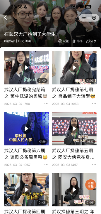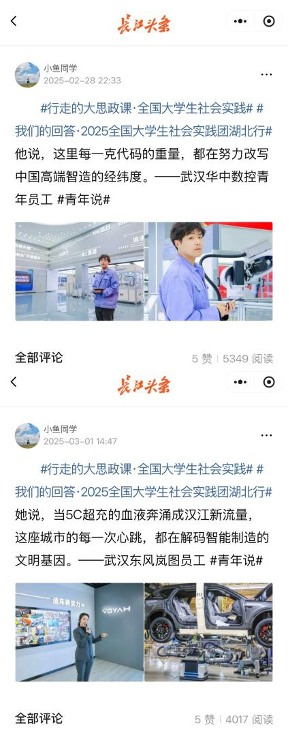 大学生实践团走过光谷科创大走廊,也观赏了长江左岸的“未来交通图景”。余典观察到,武汉正以“光芯屏端网”万亿产业集群为轴,串联起智能制造、数字安全、新能源革命的创新链。她以《武汉大厂揭秘》系列口播拆解技术密码,在《大厂青年说》作品里体悟国家发展里的青春力量。余典希望这个新闻视点不仅可以成为武汉打造“国家科技创新中心”的青春注脚,更能成为中国突破“卡脖子”技术、实现高水平科技自立自强的时代切片。