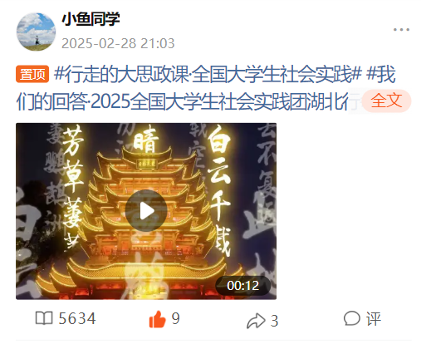 高校学子们在长江的脉动里夜访黄鹤楼,体验沉浸式戏剧中的知音传说,感受着传统文化现代表达的超级试验场。余典一直在思索,如何让文化遗产在Z世代的数字语境中重获新生,她的《诗词黄鹤》创意视频缝合着古今光影,相关AI作品也在加紧制作当中。当千年文脉与新媒体传播同频共振,新闻学子始终坚持正确导向,多思善谋、综合研判,用创造性的思维转化见证着城市IP破圈,也见证着“两个结合”在中华文明传承中的生动实践。