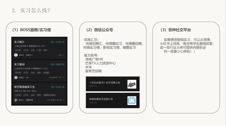 在分享会中,周千鹤还为同学们提供了多种找实习的路径。她推荐了BOSS直聘、实习僧等招聘平台,以及各类微信公众号和社交平台,鼓励同学们多渠道寻找适合自己的实习机会。