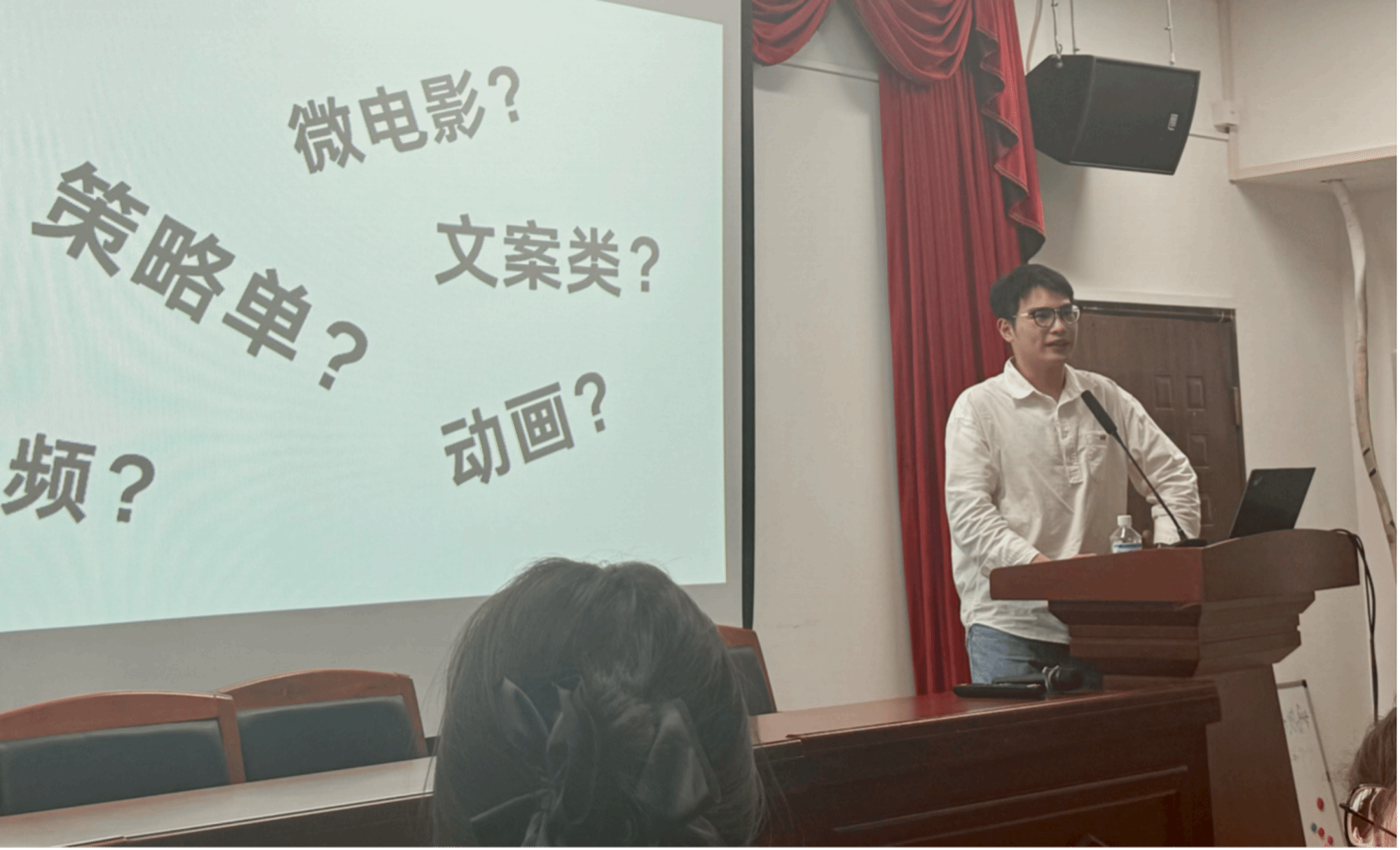 接着,2022级学长蔡秉分享了自己两次参加大广赛的经验,为同学们提供了实用的参考和策略。他从比赛的命题角度入手,为同学们分析了如何选择合适的广告命题,提出了有准确度、感染力、启发性,要回答时代问题等侧重点。此外,明晰合理的团队分工能在有限范围之内激发最大程度的创意。他鼓励同学们从生活中选择创意主题,找到新的切入点,在作品中体现出至少一个亮点,不放弃每一个想法,就有希望成功。