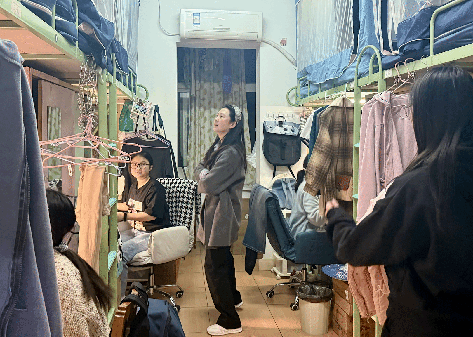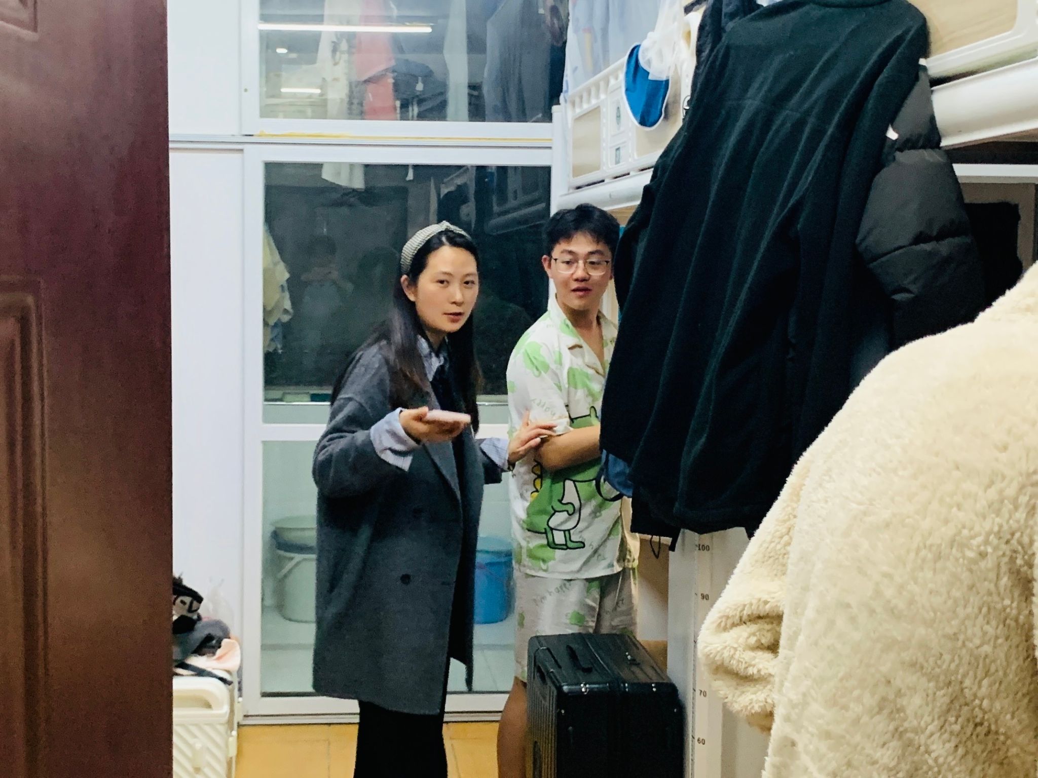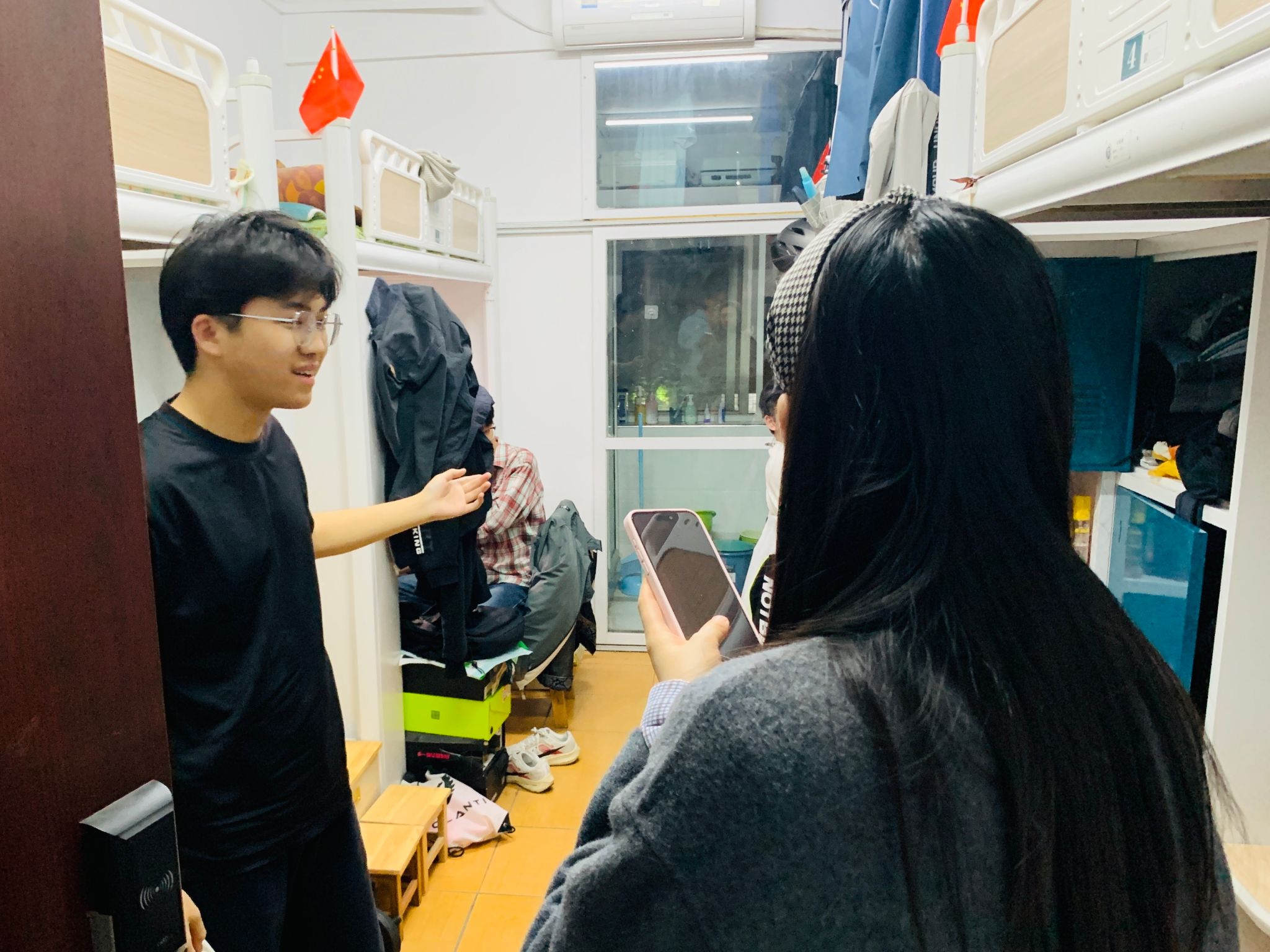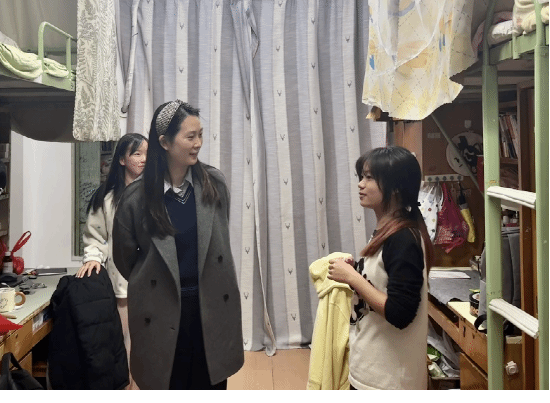 李鸿老师逐一走访了各个寝室,与同学们进行了亲切的交流。查寝过程中,老师发现寝室的整体卫生状况保持良好,同学们的个人物品整理也较为整齐,对此给予了肯定和表扬。同时,李鸿老师特别提醒同学们,要持续保持良好的个人卫生习惯,收拾好个人物品,共同维护寝室的整洁与和谐。