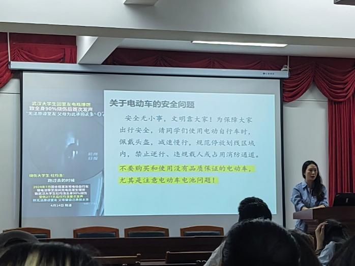 另外,针对近期湖北省高校校园电动车电池燃烧引发的风波,李老师引导同学们培养理性思维,并结合校园电动车管理、宿舍消防安全等实际问题,呼吁同学们关注身边事,践行公共责任。