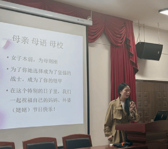 活动伊始,李鸿首先播放了三段视频,揭示了“母亲”这个词在不同语言中的读音是相似的,跟母亲有关的字都展示了母亲辛勤的付出。通过这些视频,同学们看到了母亲的无私奉献和伟大。李鸿鼓励大家在母亲节当天向自己的母亲表达最真挚的祝福和感激之情。