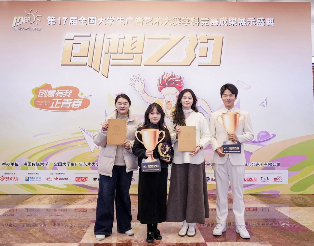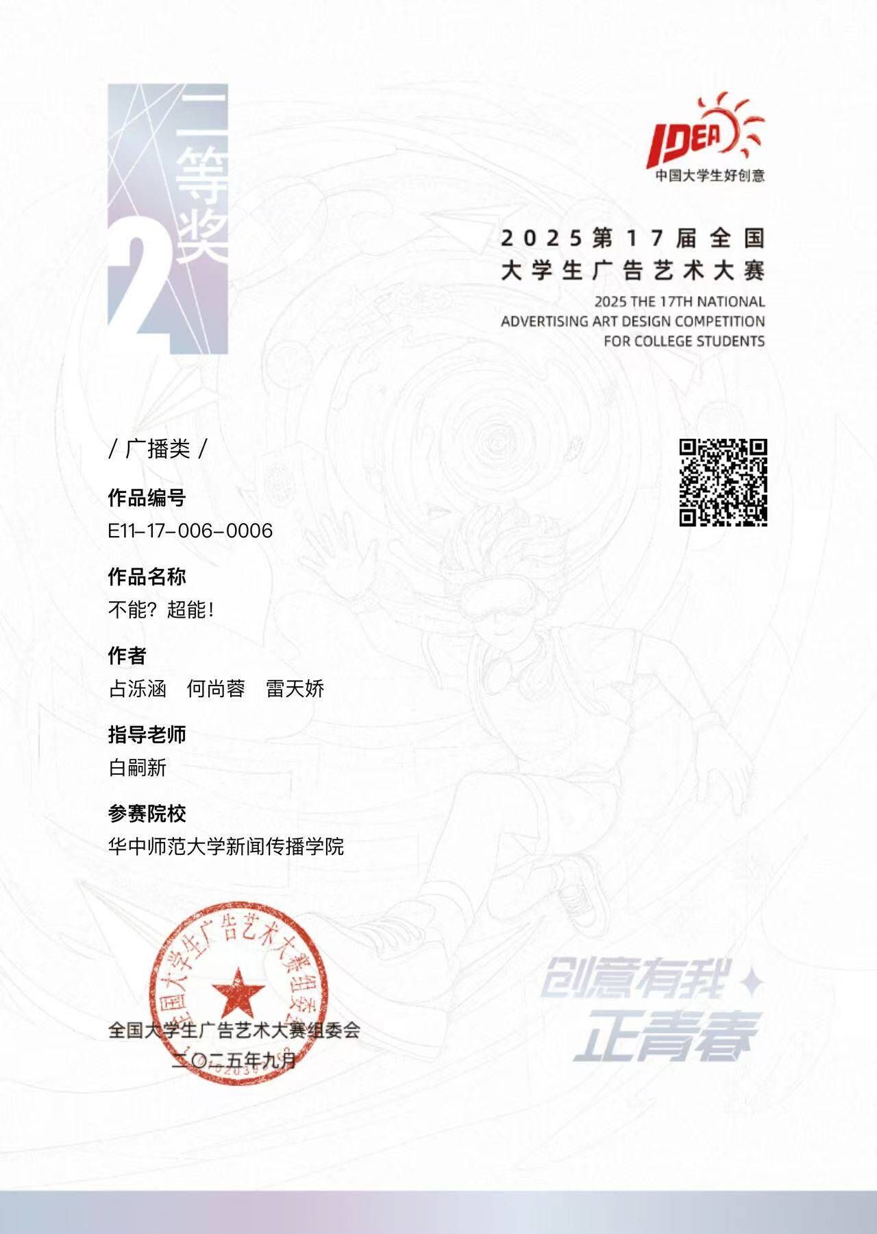 2025年12月6日,第17届全国大学生广告艺术大赛学科竞赛成果展示盛典在北京全国政协礼堂隆重举行。我院学生团队在本届大赛中表现突出,共获国家级一等奖2项、二等奖1项、三等奖1项及若干优秀奖,这是华中师范大学首次在大广赛单届赛事中同时获得两项国家级一等奖。四组参赛学生代表受邀赴京参会并上台领奖。