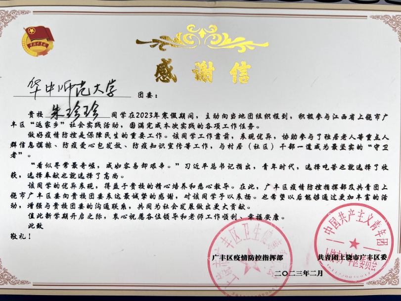 在我院组织的大学生“返家乡”社会实践活动中,广大莘莘学子积极报名,投身服务家乡热潮,利用寒假,主动向当地团委报到,协助参与基层工作,与村居(社区)干部一道成为最坚实的基层“守卫者”。我院2022级本科生朱珍珍同学表现突出,江西省上饶市广丰区团委发来感谢信,号召广大同学积极向优秀学子学习,发挥“奉献、友爱、互助、进步”志愿者精神,担当青年责任,为建设祖国贡献宝贵力量。