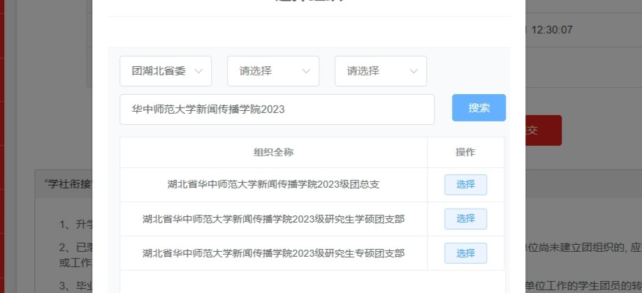 点击关系转接,按要求填写相关信息,带星号为必填。其中,在选择“申请转入组织”时需注意,请直接在搜索栏搜索“华中师范大学新闻传播学院”即可。因为我校为教育部直属高校,学校团的关系在共青团湖北省委,请勿选择“共青团武汉市委”。