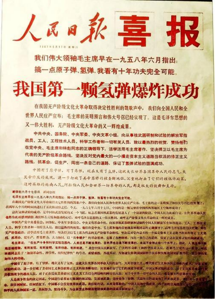 1967年6月17日,中国第一颗氢弹爆炸成功。