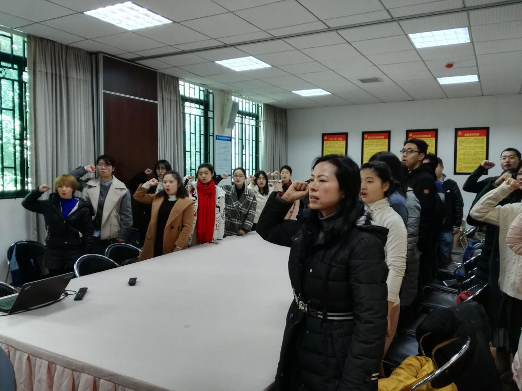 首先,全体党员起立奏唱国际歌,随后学院分党委副书记夏守信发表简短祝词,祝贺党组织充实了新鲜血液,对新加入党组织的预备党员表示欢迎。之后,党务干事李鸿宣读了参加此次入党宣誓仪式的预备党员名单,然后由分党委书记韩君华带领预备党员进行庄严的宣誓。