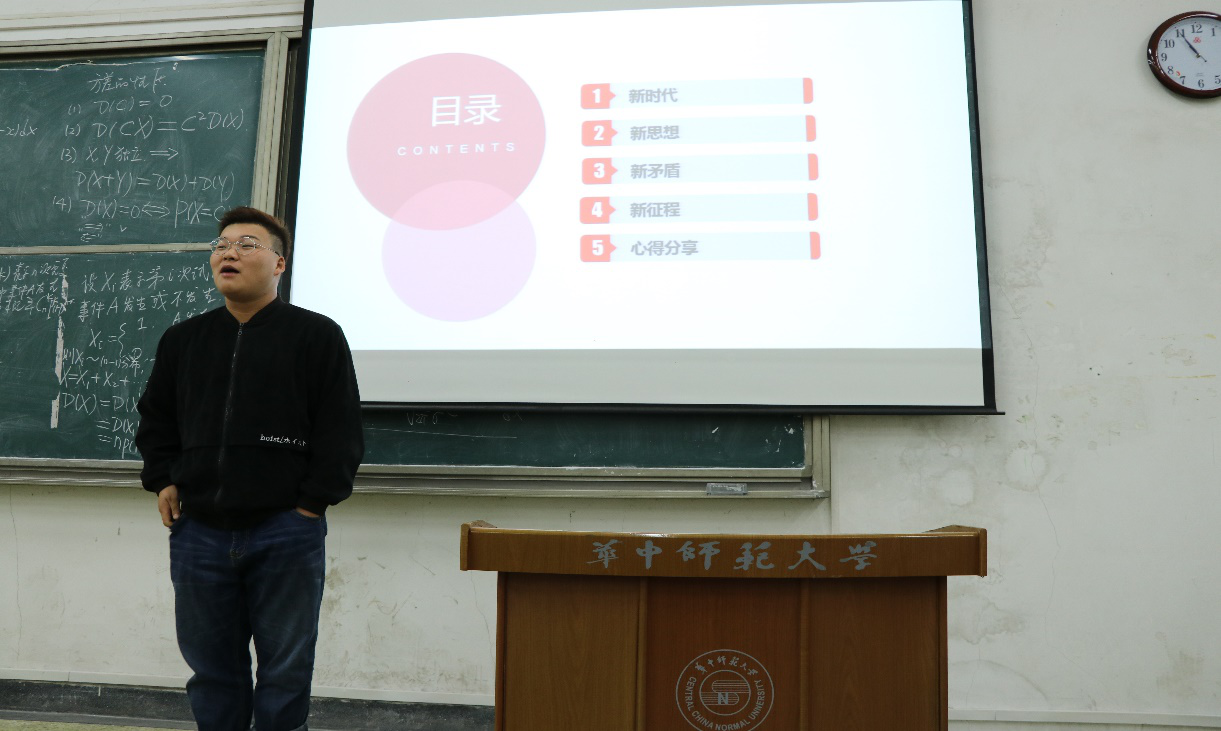 基于此,本次1505班十月团日活动的主题为“学习十九大,从我做起”。10月31日,1505班的同学齐聚于教室,开始了本次团日活动。首先是班长张振威同学进行了发言,他采用了PPT展示的方式向同学们介绍了关于十九大的基本信息,分为新时代,新的矛盾和新的思想和新的征程四个部分。在新的矛盾方面张振威着重强调了:“在中国特色社会主义进入了新的时代的前提下,我国社会的主要矛盾已经转化成为了人民日益增长的美好生活的需要和不平衡不充分的发展之间的矛盾”。他的精彩的发言获得了五班同学的一致认可和精彩的掌声。