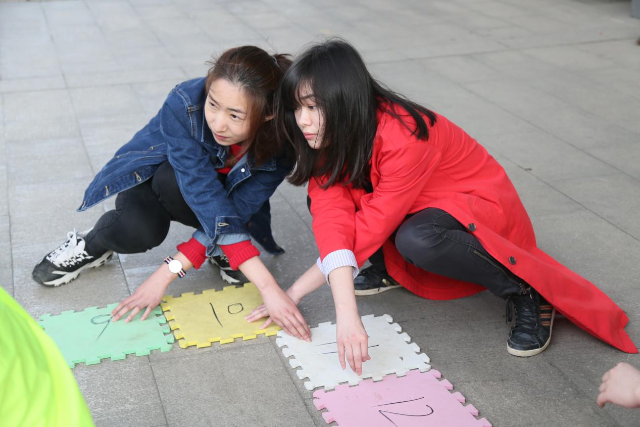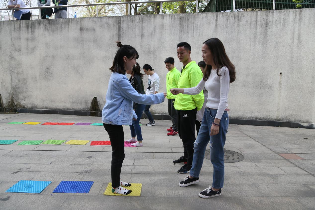 在队伍形象展示完毕之后,真正的比赛开始了。教练为大家准备了两个项目的比赛,分别是“挑战大魔王”和“极速传真”,在第一个游戏中,每个人都体验了指压板。大家似乎都忘记了疼痛,一个劲地向前跳,为自己的队伍争取时间。“极速传真”中,每个队伍都经历了几次失败,游戏项目充满了挑战和难度。两个游戏都十分考验大家的反应力和团队协作能力,但是在所有队员的互相鼓励和良好的沟通下,大家都顺利完成了所有比赛项目。
