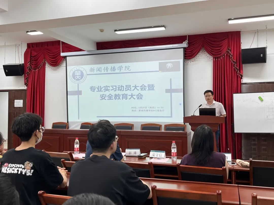 华新在线讯(通讯员 吴亦晗)为促进我院专业实习的顺利开展,强化实习管理,明确实习内容,确保实习质量,6月29日下午,新闻传播学院在学术报告厅召开2020级专业实习动员大会暨安全教育大会。出席本次大会的有我院党委书记夏守信,副院长彭涛,党委副书记程秀莉,张德华老师,周莉老师,黄月琴老师,陈科老师,辅导员杜雨薇老师,教学秘书吴迪老师与2020级全体学生。本次会议由彭涛副院长主持。