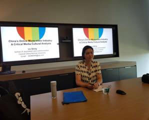 临回国前,刘琼作了题为China’s Online Micro-video Industry: A Critical Media Cultural Analysis(《中国网络视频产业的批判性媒介文化分析》)的英文报告,并与在座专家就中澳两国网络视频文化产业中的若干现象进行了专题研讨。