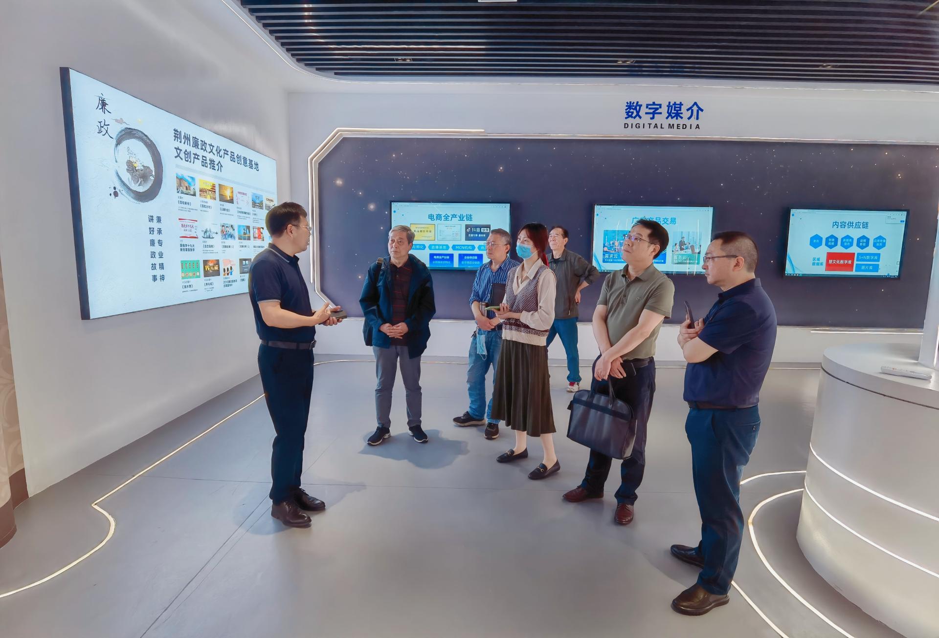 4月19日上午,访企拓岗分队一行在荆州日报社社长、荆州广电集团党委书记代志武和原荆州电视台总编辑边三红陪同下,与长江大学人文学院院长何世龙一起参观了楚文化数字产业园。