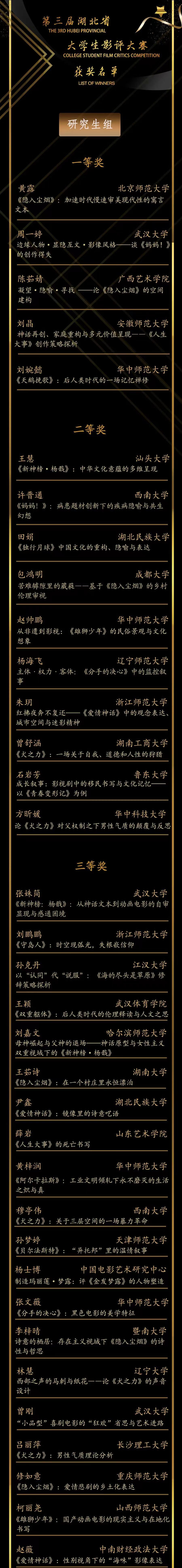 华新在线讯(通讯员 谭佳媛)近日,第三届湖北省大学生影评大赛获奖名单正式公布。经全国各高校学生的激烈角逐,评委层层评选,最终我院学生刘婉懿、黄梓润及张文薇的作品突破重围,分别获得了研究生组一等奖及三等奖两项的佳绩。林吉安老师获大赛“优秀指导教师”称号。