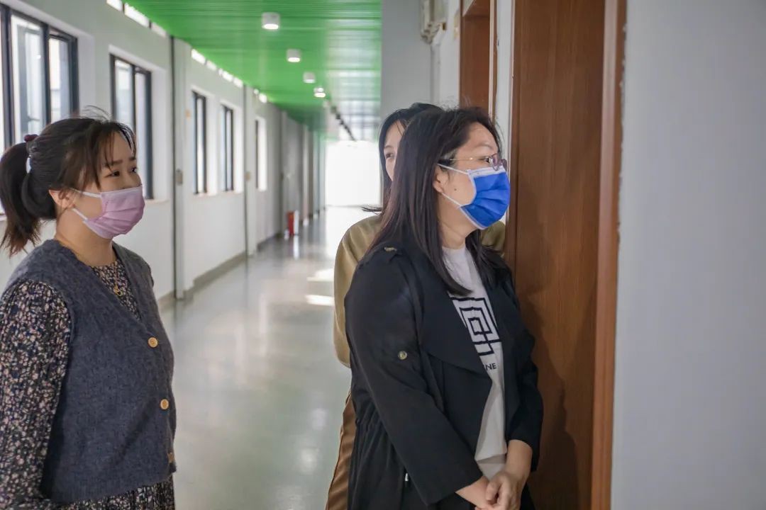 (程秀莉副书记与本科生辅导员在教室外观察师生上课情况)
