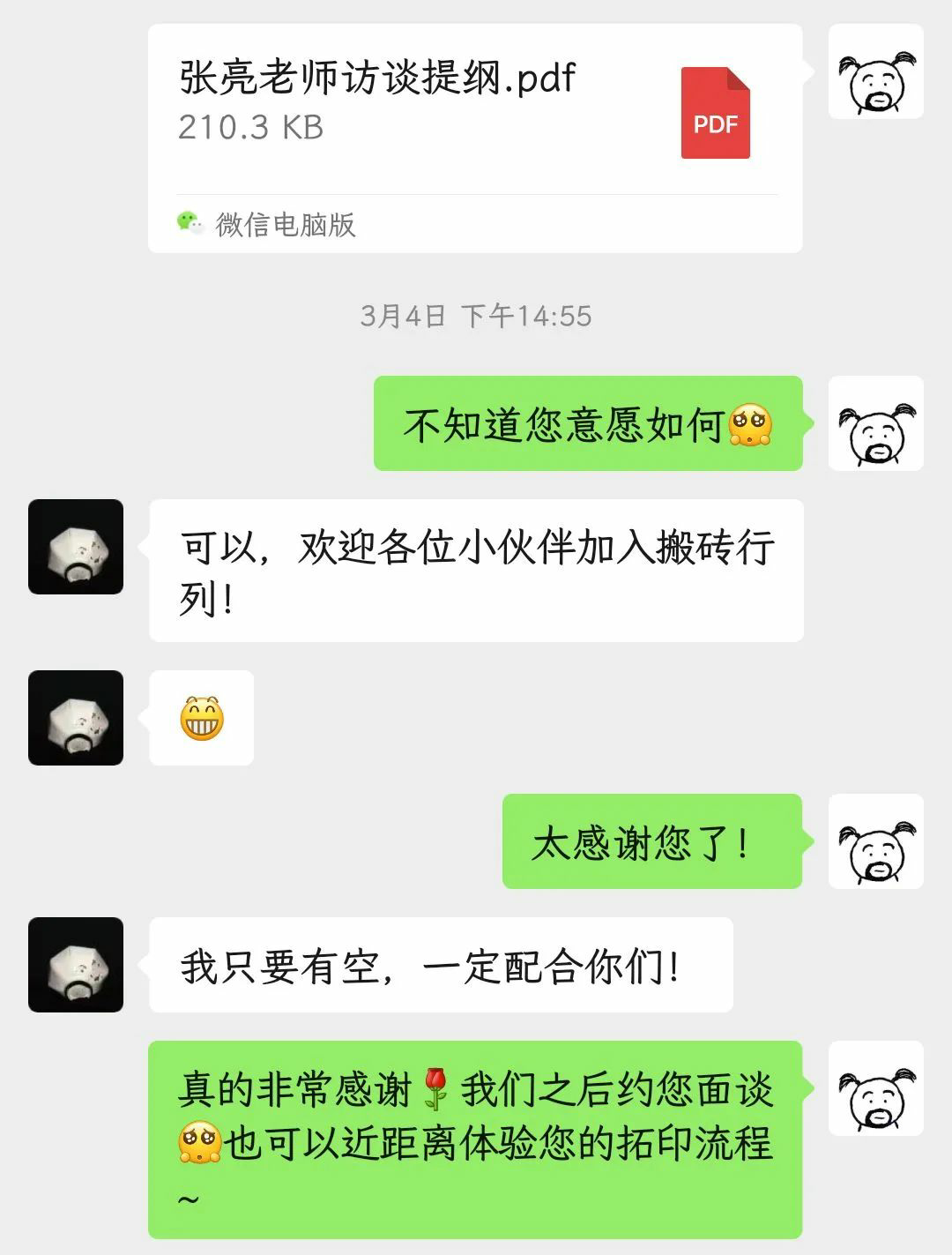 团队成员邀请非遗传承人张亮老师参与拍摄的相关聊天记录