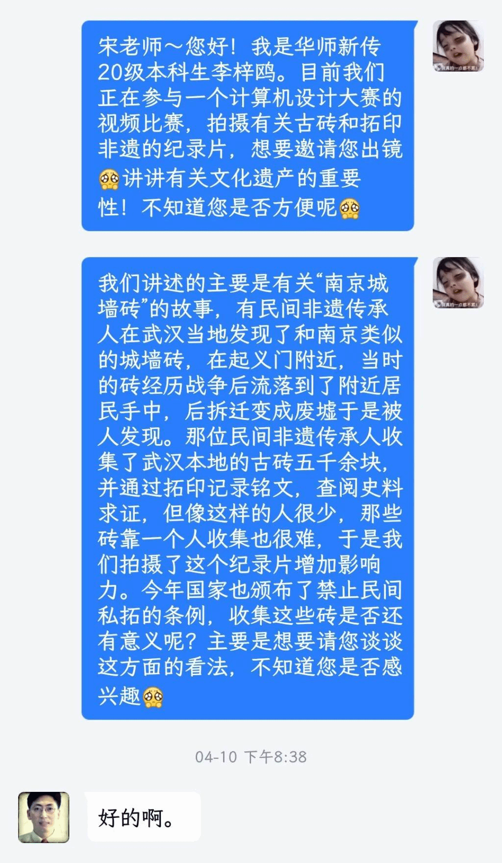团队成员邀请宋亦箫老师参与拍摄的相关聊天记录