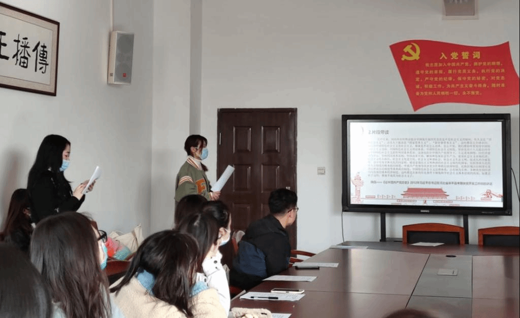 活动伊始,全体同学起立奏唱了《中华人民共和国国歌》和重温了入党誓词。接着,同学们共同观看了视频《这百年》。视频以中国共产党的历史发展为主线,全方位、多角度地展示了百年来党的重要历史转折点以及重要成就,生动地诠释了中国共产党为什么能、马克思主义为什么行和中国特色社会主义为什么好,引发在场同学的共鸣。