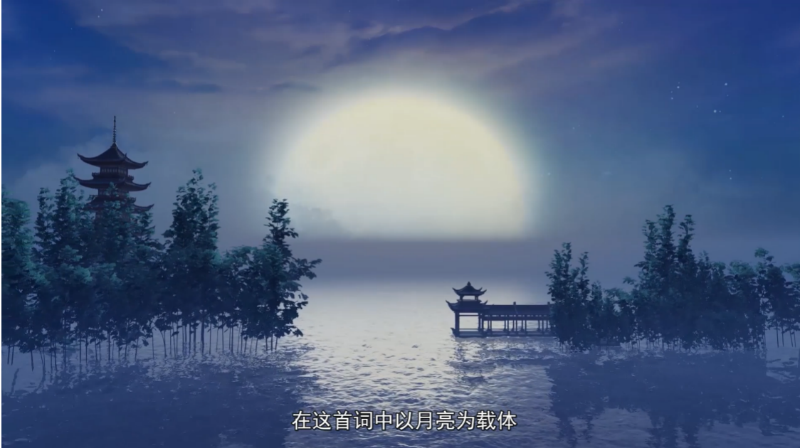 该微课作品基于高中教育大纲中对中国古诗词的学习要求,以高中学生在古诗词学习过程中所遇到的诸多学习困难(例如诗词概念过于抽象、对于诗词讲诉的内容和诗人情感难以把握等等)为创作起点,以三维动画为表现形式创作而成。作品选取了五位宋词大家的经典词作,利用建模工具创建模拟这些诗人在创作具体诗词时的情境,和具体诗词背后所要呈现的画面,致力于将抽象的诗词情景化,并以解说词和对话的形式活跃画面,帮助学生更好地理解诗人与诗词。同时,从小切口切入,抓住了宋词中的“月”这一主题,为学生归纳月亮的部分典型意象,引导学生培养归纳总结的能力。