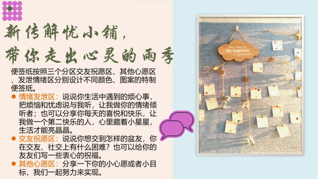 板块三:“烦恼漂流瓶”减压信箱——来信&回信。同学们可以自行投稿,诉说这段时间一些困扰内心的小秘密,可以直言直语,可以长篇大论,并在信封上注明自己独有的昵称,投到“烦恼漂流瓶”减压信箱中。工作人员会定期收集并做逐一回答,并统一提醒投稿者到达原地点取回自己的信封。