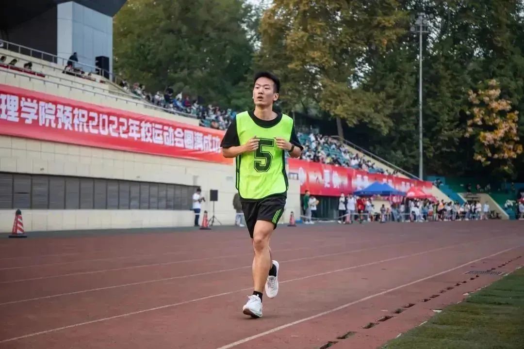 一声枪响,选手们纷纷冲出起跑线。最初,杨思辑按照自己的节奏奔跑着,并在最后100米时开始持续加速,直至冲过终点线。而在本次比赛中,和杨思辑一起奔跑的还有我院2022级未参赛的男生们,他们轮流高举院旗,为我院参赛选手加油助威。赛后,杨思辑回忆道:“听见场外老师和同学的加油声时,我就感觉有力气坚持下去了。”