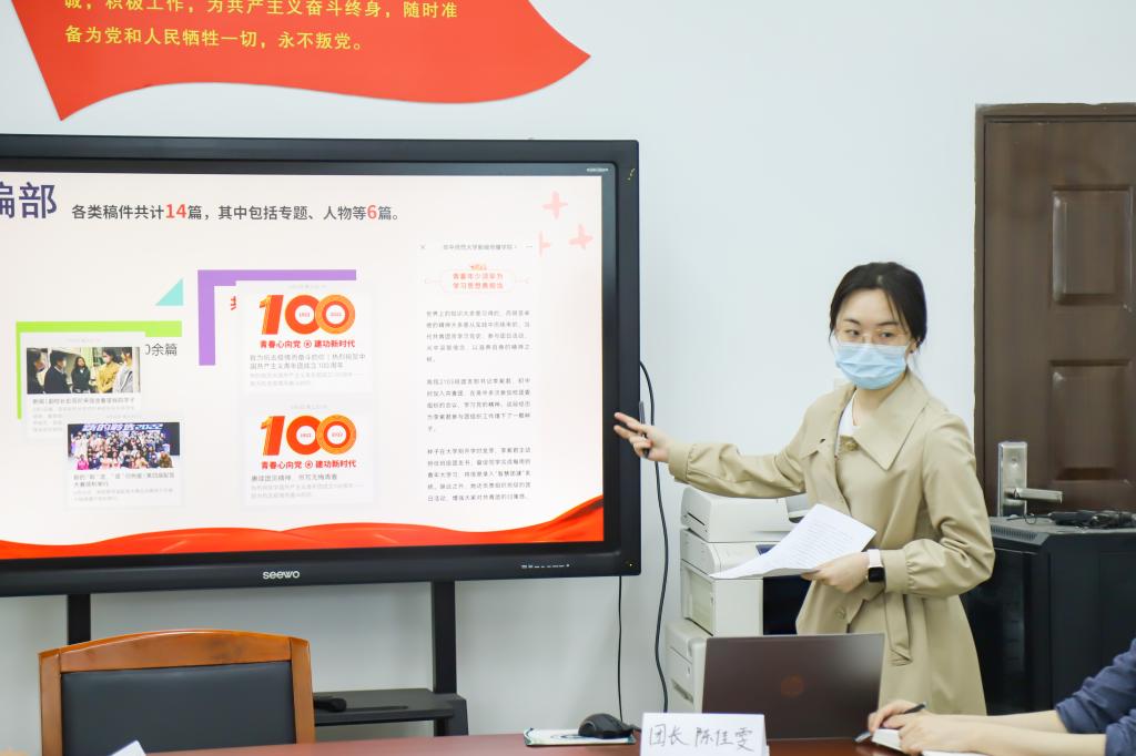 恽代英新闻采访团团长陈佳雯围绕近期工作成果和未来工作规划两部分进行汇报。她总结了换届后各部门的新闻产出成果,并向大家展示了学院公众号推文在单日点击量上的突破。随后,她介绍了新闻中心近年来孵化出的专题项目和获得的荣誉。谈到未来规划,陈佳雯表示,除了记录方寸毫厘间的华师微事、新传微事,新闻中心成员也将走出校园,力争讲好中国故事,献礼党的二十大。