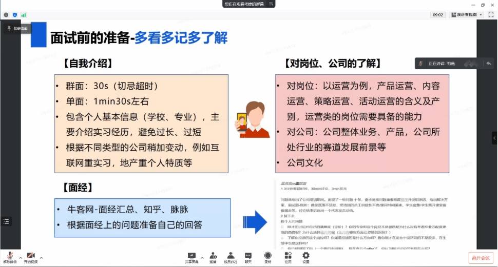 毛婕首先简要回顾了秋招期间的求职经历及成果,随后就简历制作、简历投递、面试准备、如何提高面试通过率和面试后的复盘等五个部分展开详细交流。