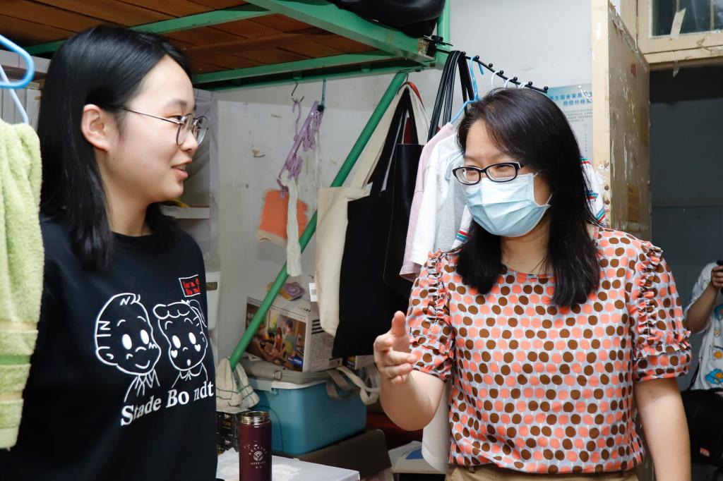 在2018级宿舍,程秀莉及辅导员李红玉就在寝人数,以及未在寝学生的情况进行确认核实。对于在寝学生,程秀莉询问了她们的返校细节,并就校园生活的疫情防控提出要求,提醒她们在公共场合佩戴口罩、保持卫生等。