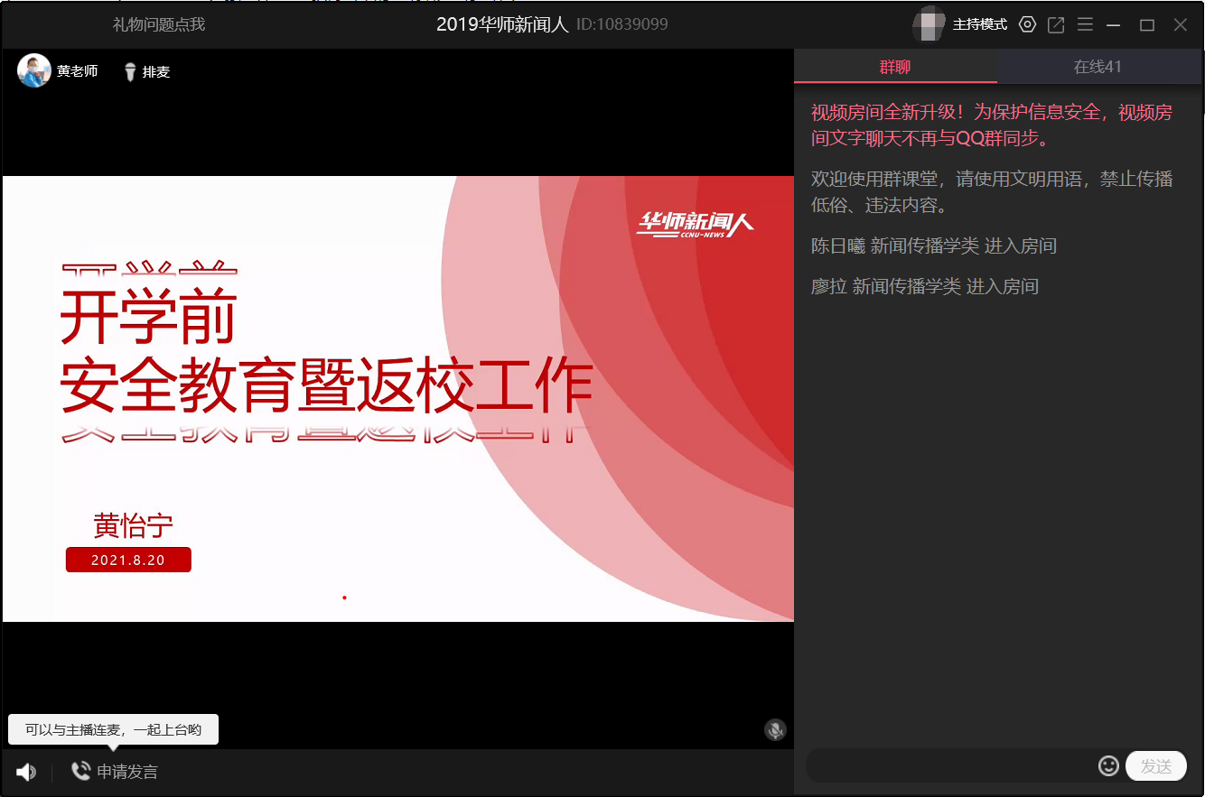 华新在线讯(通讯员 陈日曦)随着国内新冠疫情的形势变化,在开学季即将到来之际,我院进一步规划开学方案及师生返校方案。8月21日晚,我院2019级辅导员黄怡宁在网络平台开展晚点名暨开学前返校工作及安全教育活动,全体2019级本科生参加。