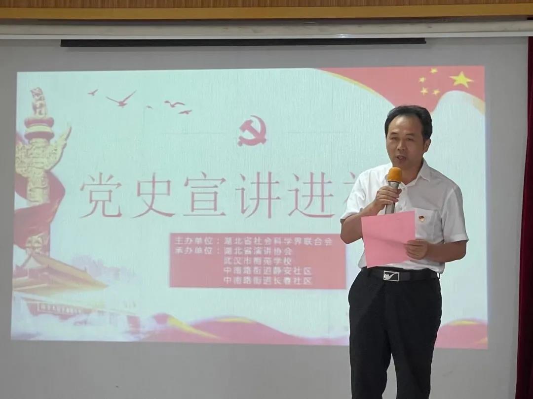 5月14日下午,华中师范大学新闻传播学院副教授李理带领“大学生红心宣讲团”走进武昌静安社区,开展《红色经典阅读与传播》社会实践课程。课程旨在通过讲述中国共产党诞生的历史故事,引导广大党员干部和群众共同学党史、知党情、感党恩、跟党走。本次课程联合武昌区中南路街道静安社区、湖北省社会科学界联合会、湖北省演讲协会、梅苑学校小学部和长春社区共同开展,参加课程的党员和师生代表共60余人。
