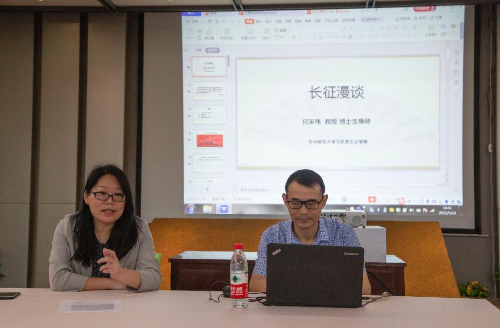 (华新在线讯 通讯员 王希凡)5月14日下午四点,新闻传播学院全体师生党员于校史馆开展了第一次党史学习活动。本次主题教育活动分为两个环节,一是由马克思主义学院教授、博士生导师何家伟开展“漫谈长征,新民主主义时期党史大学习”的讲座,二是由恽代英党支部书记黄怡宁和2020级研究生党支部党员代表黄茹娟作交流发言,旨在让全体党员通过聆听、学习把握历史发展的脉搏,感悟优秀党员浴血奋战的辉煌历史。