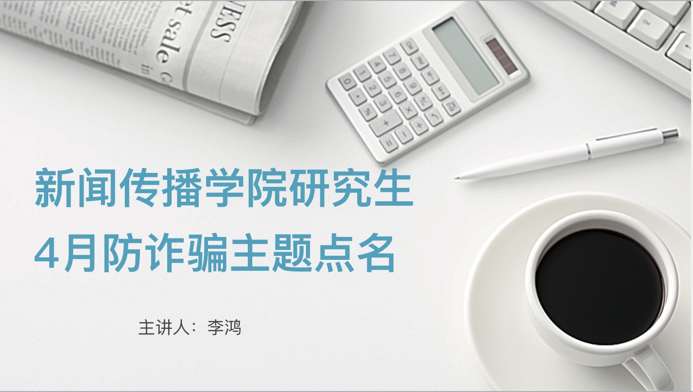 2021年4月29日晚上7点,新闻传播学院19级、20级全体研究生于线上参加了4月防诈骗主题点名活动。本次活动内容主要分为四个板块:防诈骗主题教育、“五一”安全教育、意识形态教育和非毕业生须知,由辅导员李鸿老师主持。