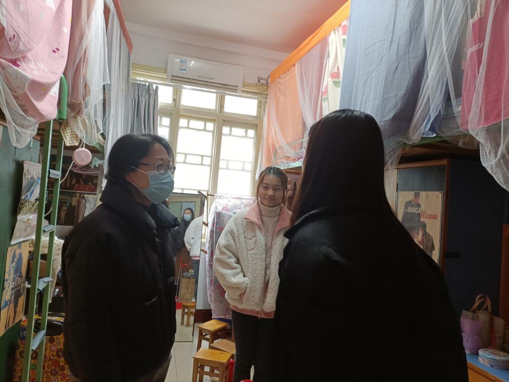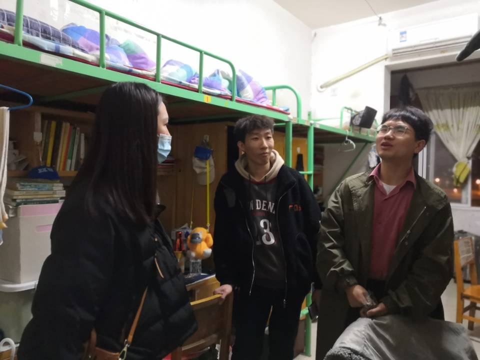 3月4日晚七点,研究生专职辅导员李鸿、学生兼职辅导员肖琼琼、学生干部吴绣云前往国交4栋看望其余研究生同学。辅导员李鸿叮嘱大家注意保暖,认真询问了同学们假期学习、生活情况以及之后的学习、工作计划,并提出了相应的建议。