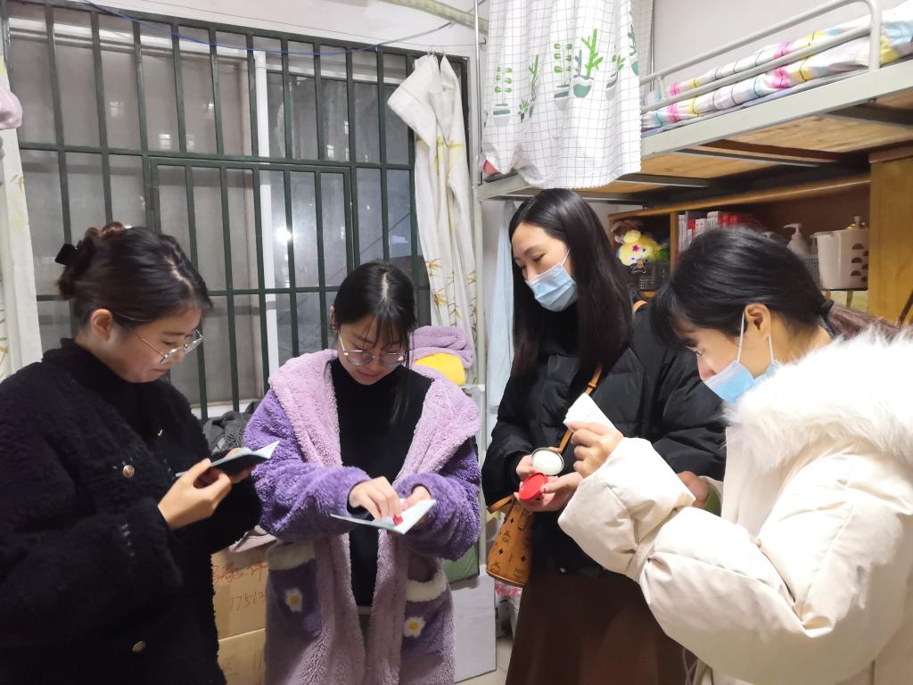 由于我院研究生住宿楼栋分布较分散,3月3日晚,研究生专职辅导员李鸿、学生兼职辅导员肖琼琼以及学生干部罗思妮又依次前往东区10栋、东区11栋、元宝山一栋、东区十六栋、东区附一栋看望同学们。为了照顾到部分因特殊原因还未来得及到学院注册的同学,辅导员李鸿特意叮嘱带上注册章和印泥,在走访寝室的过程中为同学们完成注册。