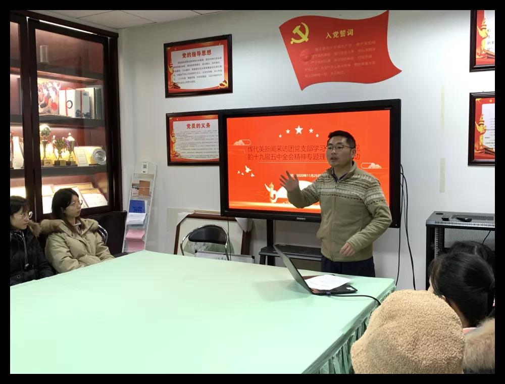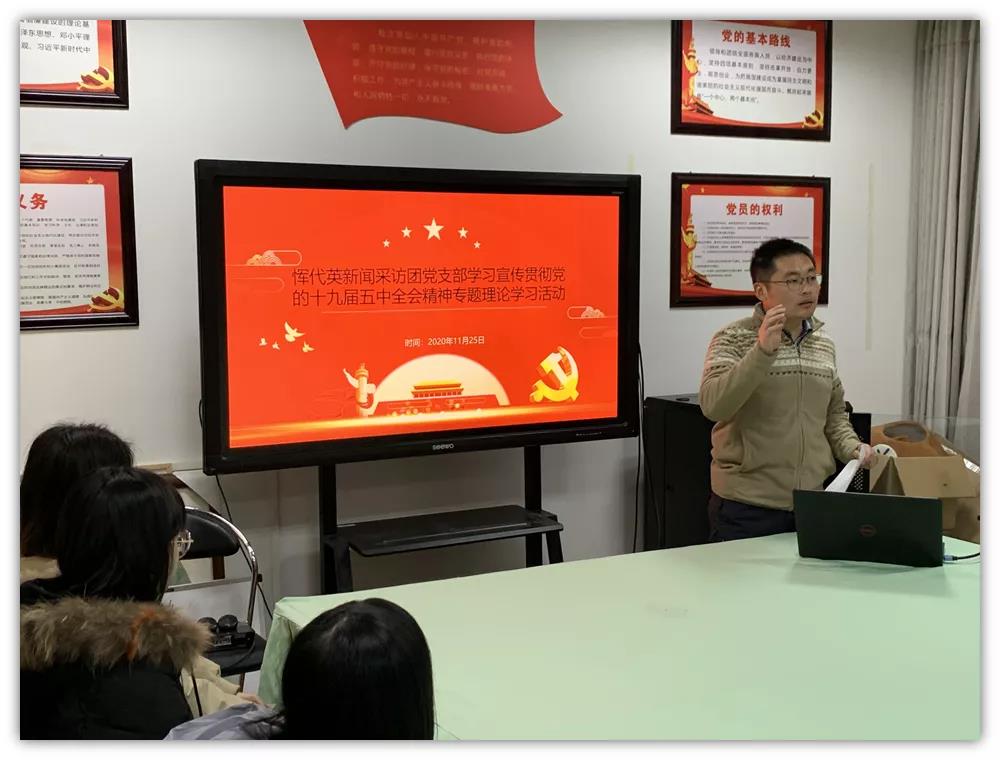 华新在线讯(通讯员 温绮雯)11月25日中午,为学习贯彻党的十九届五中全会精神,恽代英新闻采访团党支部在学院会议室开展了专题理论学习活动。支部书记黄怡宁出席并主持,支部部分党员、发展对象及入党积极分子参与本次活动。