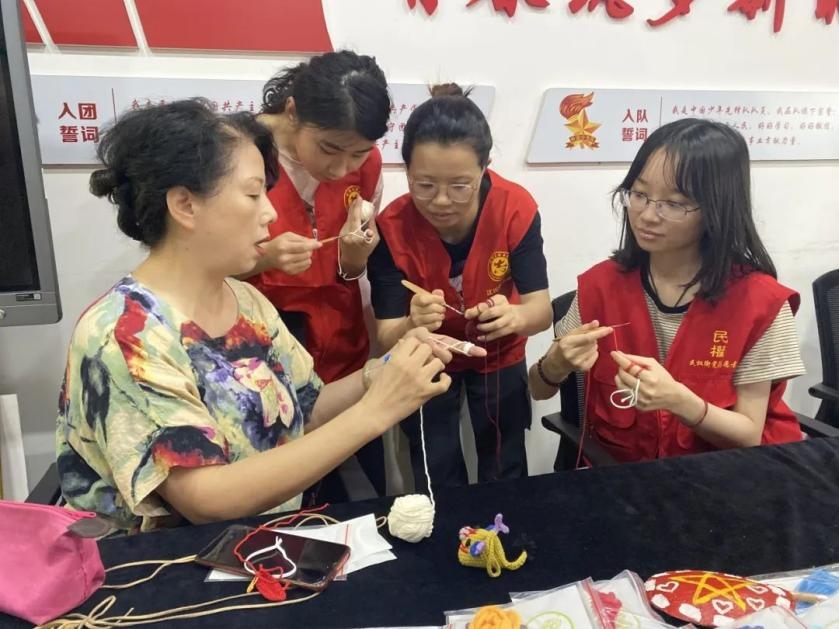 一走进打铜社区,同学们就被一股浓厚的传统文化氛围所吸引。在桂香编织社,阿姨们正在忙碌地编织着彩色粽子。大家被这巧夺天工的技艺深深吸引,迫不及待地加入了编织的行列。在阿姨们的指导下,同学们尝试着用钩针将彩色的毛线编织成粽子形状。虽然起初大家的手法略显笨拙,但随着时间的推移,逐渐掌握了技巧后,手中的彩线也慢慢变成了形态各异的粽子。每一个粽子都承载着大家对传统文化的热爱和尊重。
