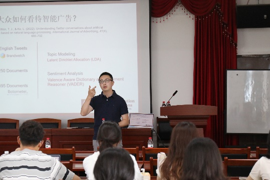 讲座伊始,吴林晚通过“智能广告”的定义切入,分享了自己如何提出研究问题并推进研究深入:在学界找文献、在业界找行业期刊、在社交媒体上找用户大数据。吴林晚以自己围绕“智能广告和消费者心理”开展的实证研究为例,分享了大众如何看待智能广告、业界如何谈论智能广告、学界如何研究智能广告以及消费者对智能广告的反应,详细梳理了这些案例中的研究方法、研究问题、研究结论等内容,向同学们介绍了结构方程模型(SEM)、用于人机交互研究的互动媒体效应理论 (HAII-TIME)、解释级别理论等方法和理论,给予同学们多方面的学术启发。