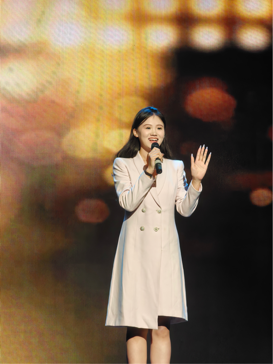 能够参加比赛,感谢勇敢走出舒适区的自己,感谢学院专业老师给我的宝贵的机会,感谢热心帮忙找资料的学姐……在校赛阶段老师们就在为我们找寻资料,根据每个人的主持风格、量身打造。“既然要做便全力以赴,不认真准备就相当于弃权”、“做最积极的准备,最坏的打算”,老师们的嘱托每次像一剂强心剂。因为抽到的上场顺序比较靠后,在观看其他选手展示的过程中,其实我的心态是慢慢松弛的,带着学习的态度来。站在台上看不清台下黑漆漆的一片,只剩一盏巨大的圆形灯迎面相撞,“准备好了……”一切更像是与自己的对话。在展示过程中,心中的想要成为的样子也渐渐明朗,被赛制推着向前走的每一步,如婴儿蹒跚学步,摇摇晃晃却不改方向。相信花有花开,人有时运,怀爱与诚,静待来日。