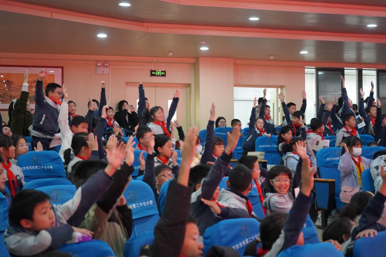 活动现场,光谷二十七小学生演绎课本剧《我心中的英雄》,华中师大大学生红心宣讲团沉浸式呈现《最后的家书》,再现江姐等先烈的家国情怀;光谷二十六小舞蹈《映山红》、华科大附属花城中学诗乐舞《点亮中国》、五校合作配音秀《光影传情》等节目精彩纷呈。在“说英雄·画英雄”环节,孩子们用画笔与词语诠释英雄品质。“湖北省最美志愿者”、光谷二十七小学生李宇峰作《以湖为证承壮志 以少年志颂荣光》主题宣讲,展现新时代少年的责任担当。