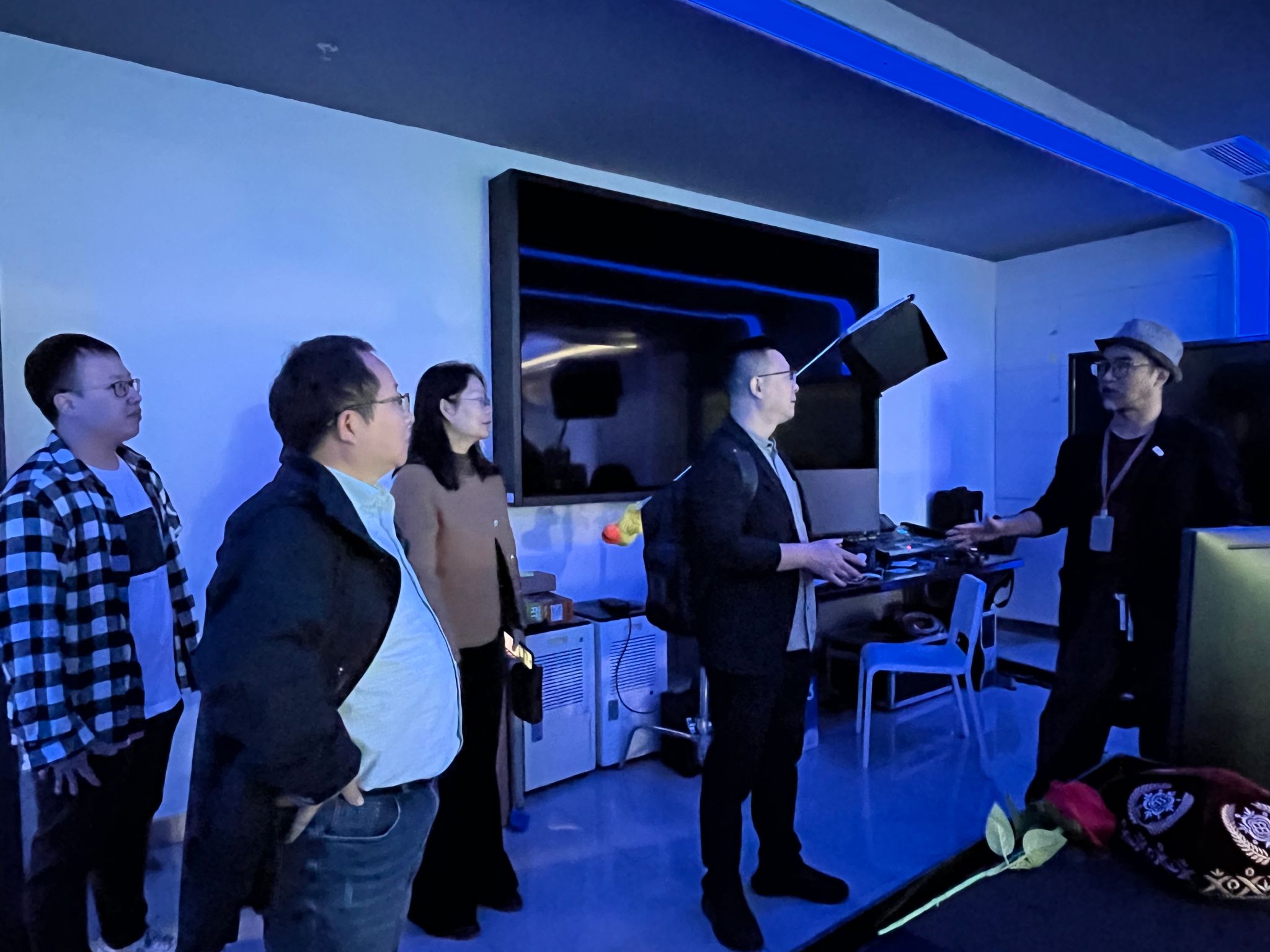 座谈会开始之前,学院一行参观了传播学院实验室,深度了解其AI辅助音视频制作创作实验室、AI辅助电影制作全流程体验实验室及数据中心等实验室建设情况。